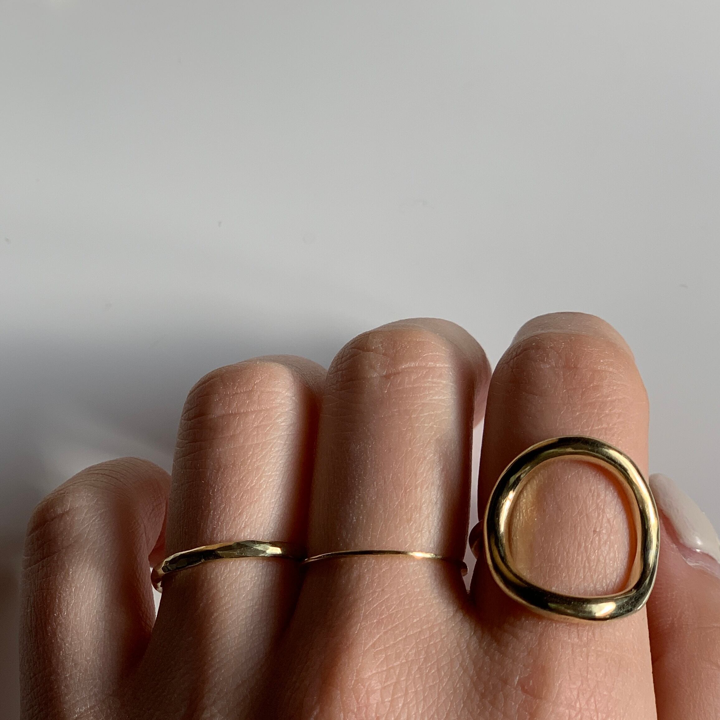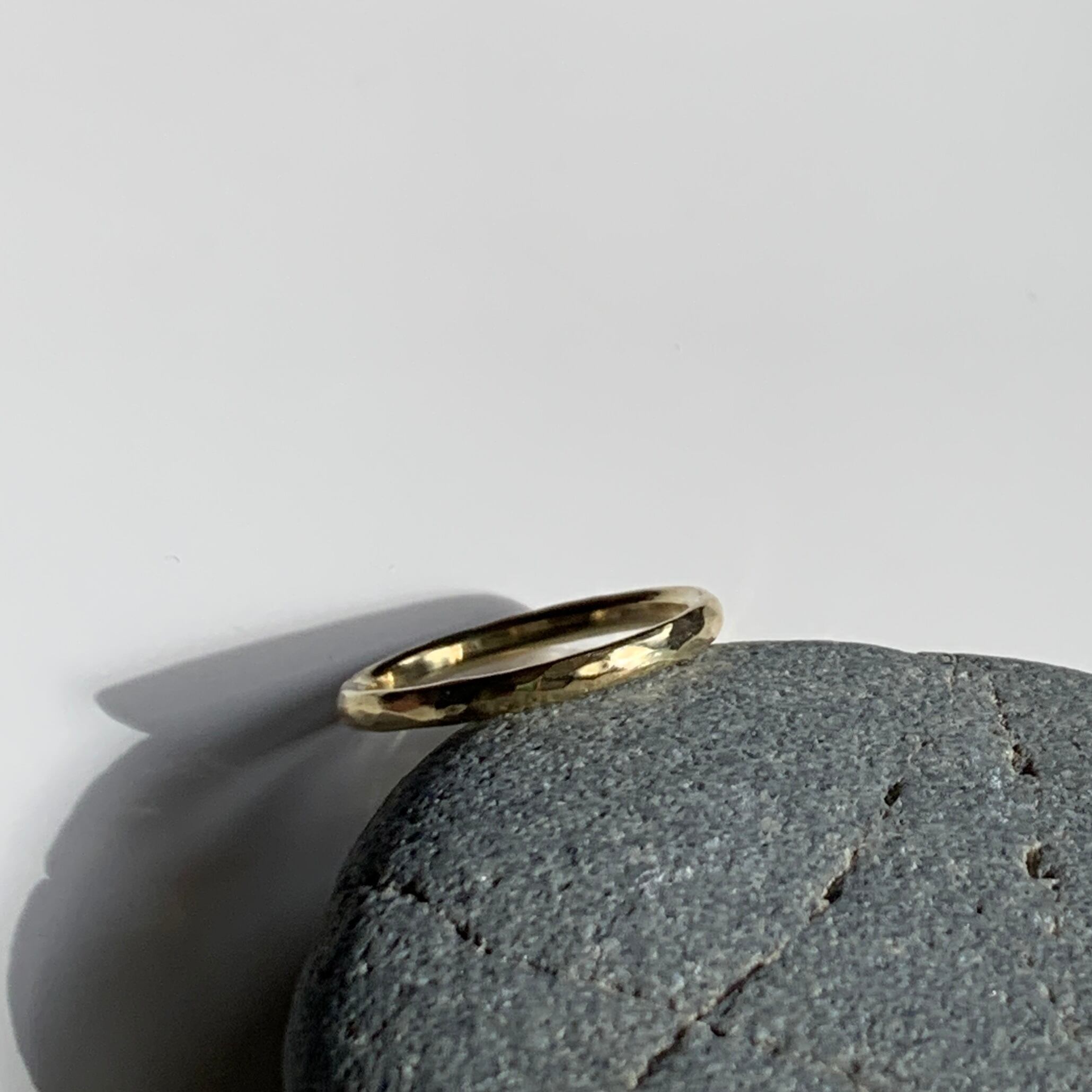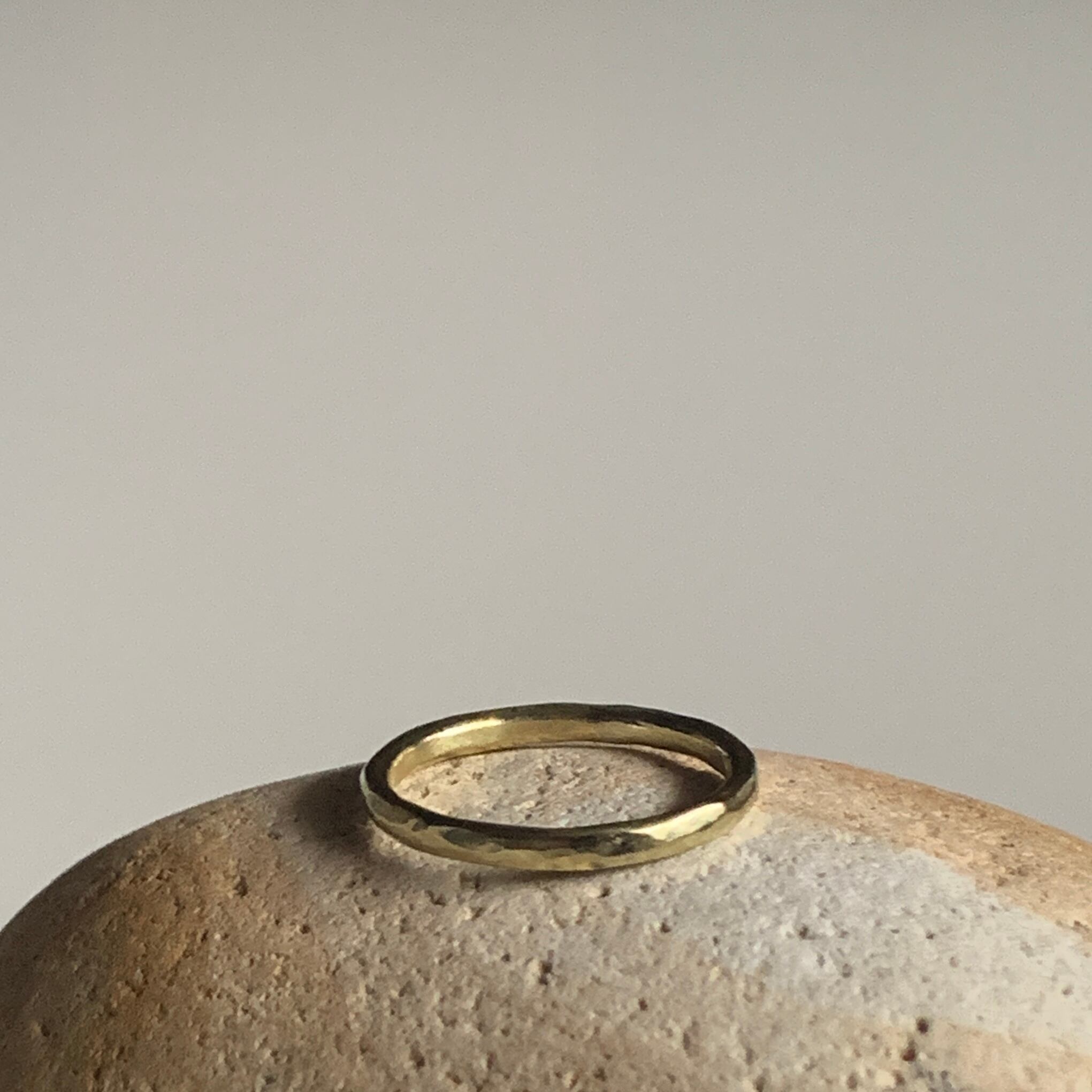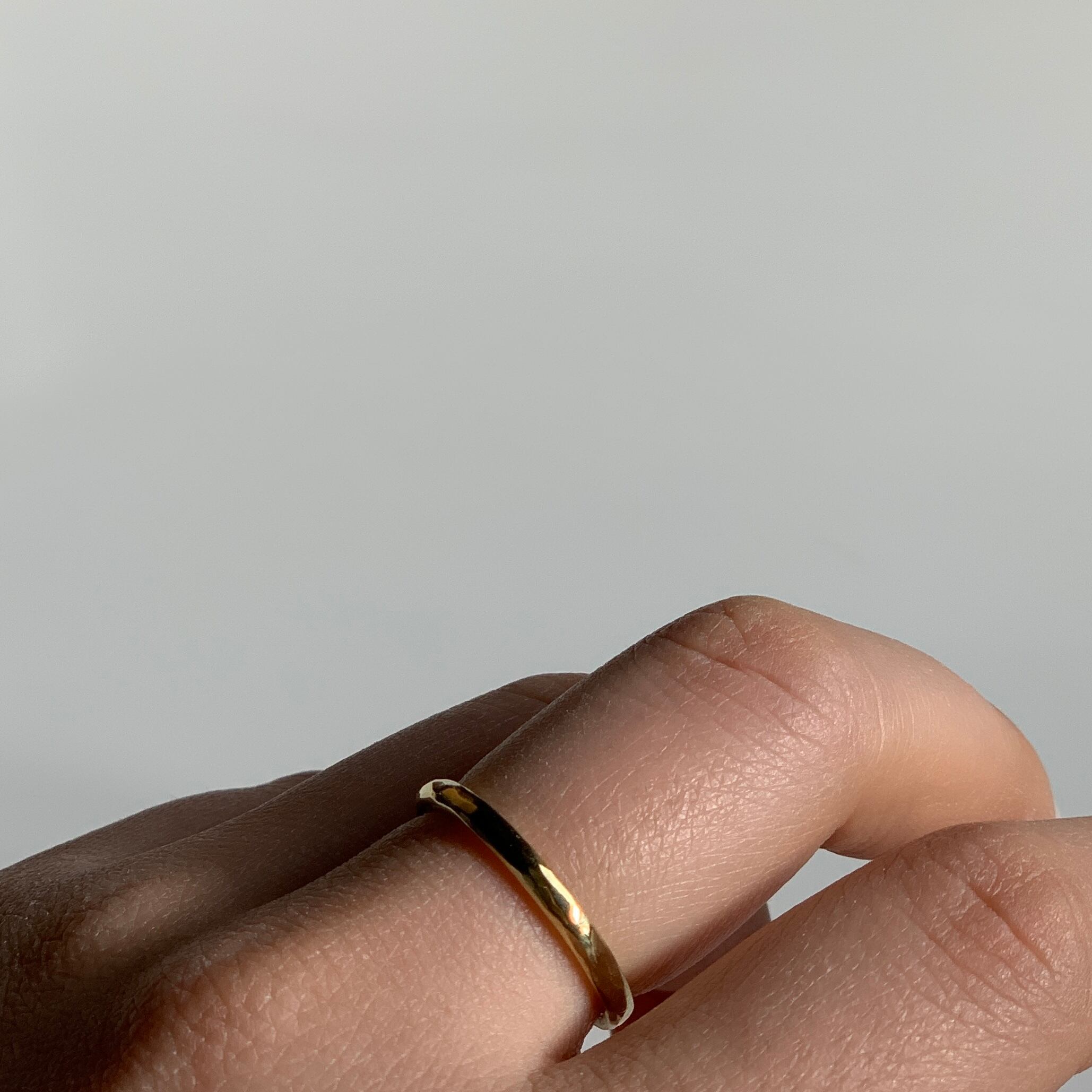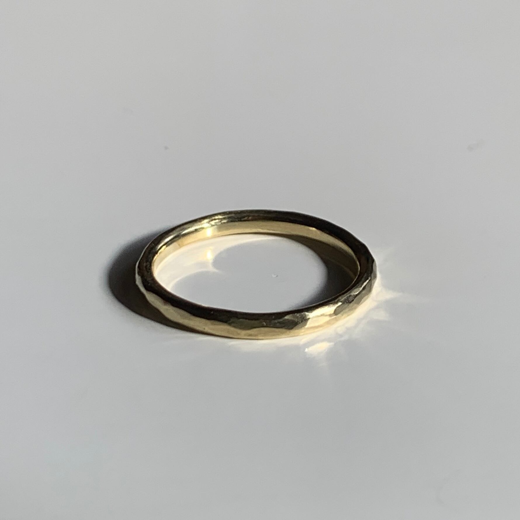 表面を叩いてキラキラとした表情をつくりました。シンプルで身につけやすいリングです。