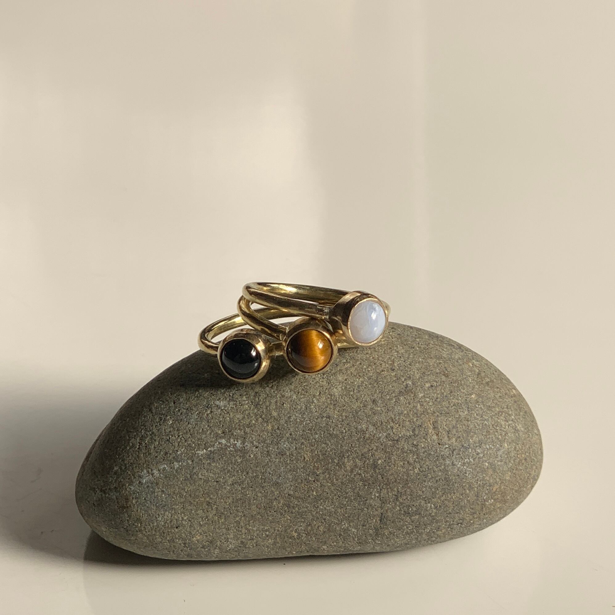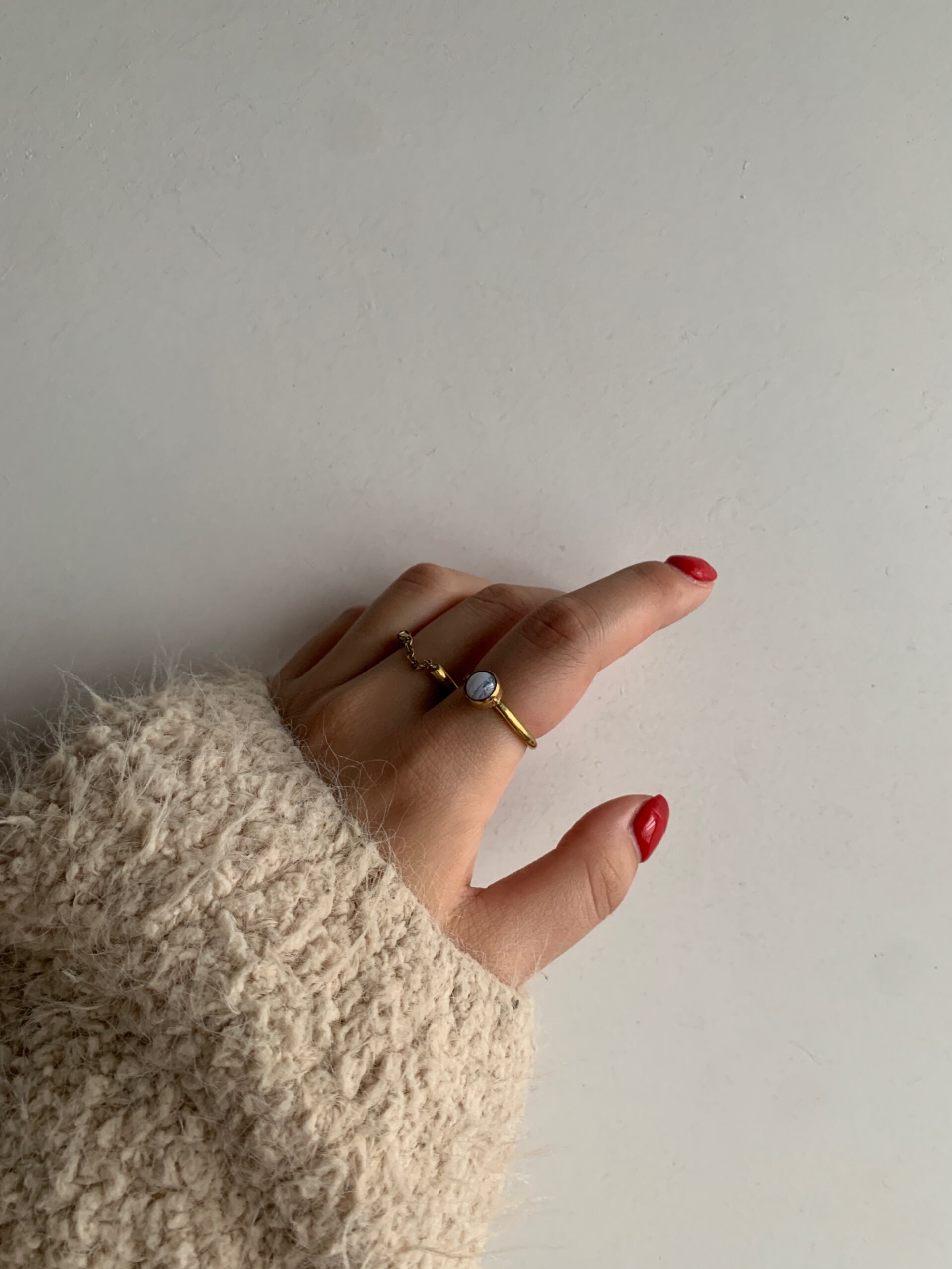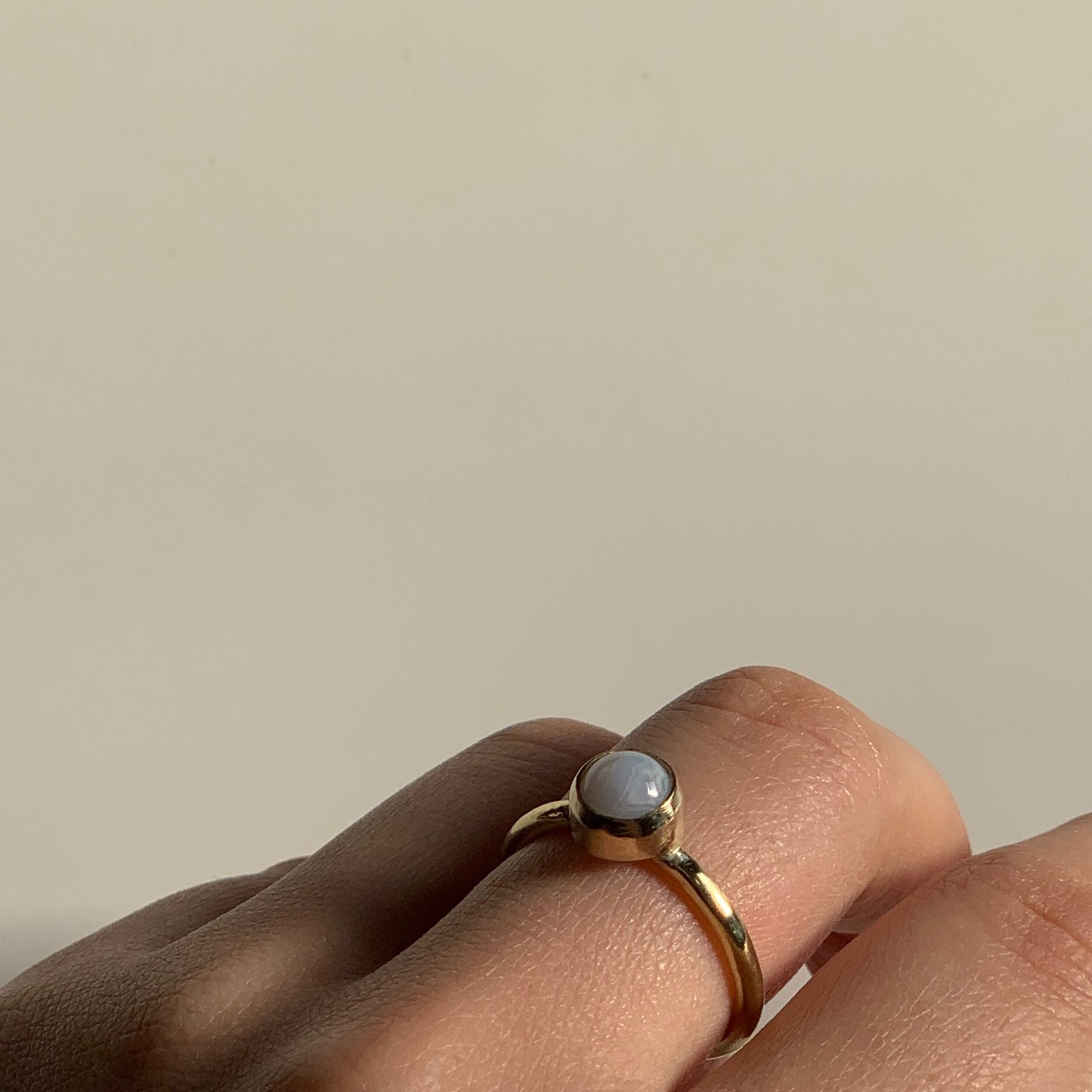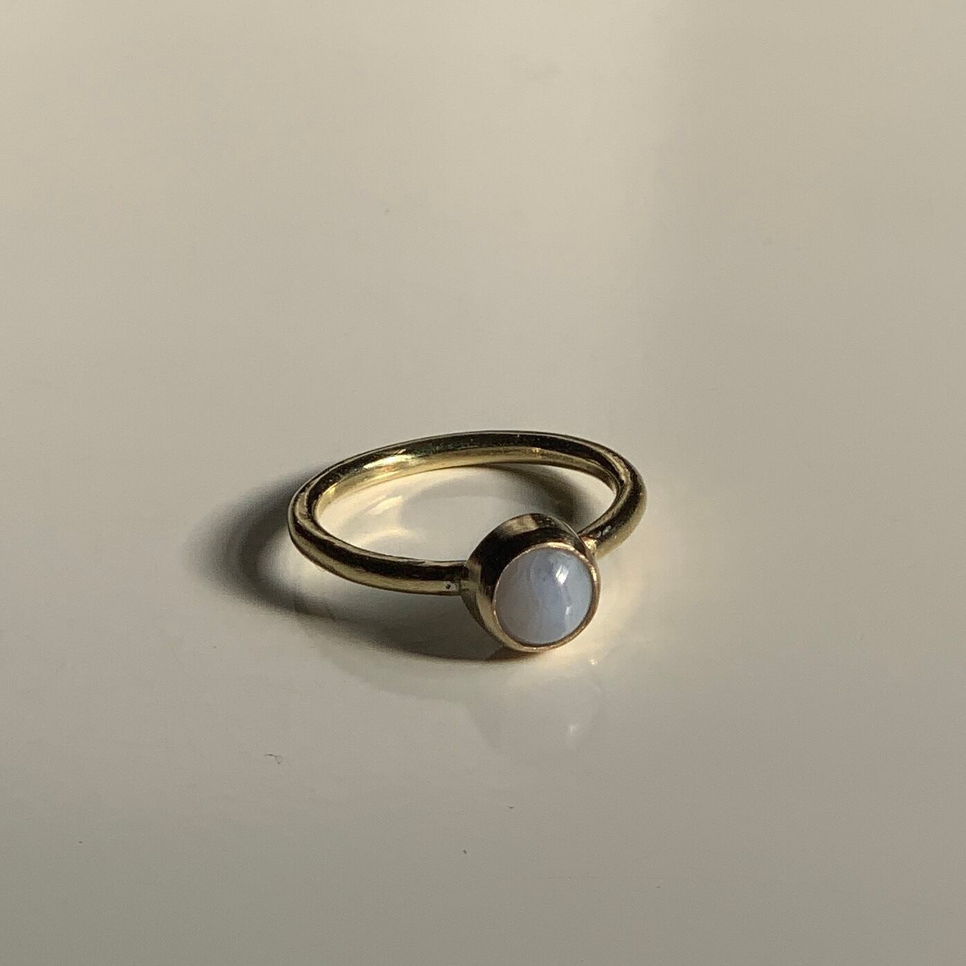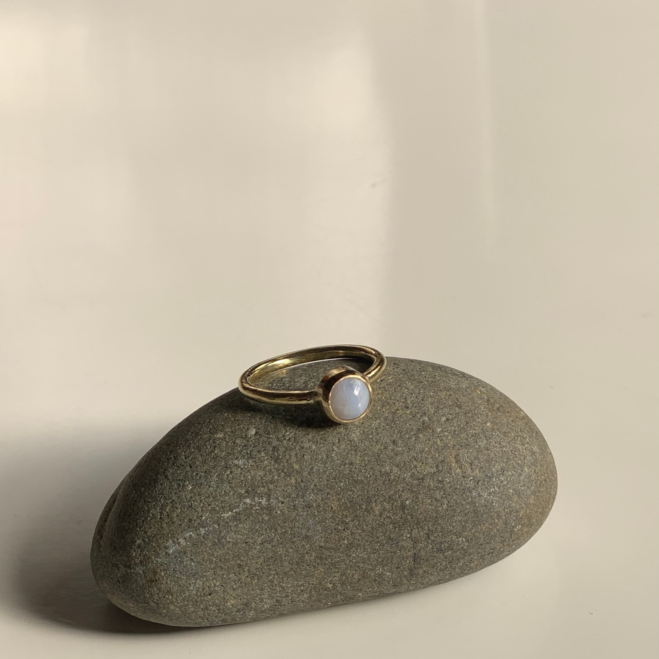 ブルーレースアゲートの天然石を使用しています。ほんのり青みがかっていて手元を上品にみせてくれます。控えめな模様が美しい石です。